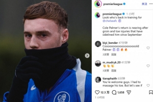 在周一的新闻发布会上,切尔西主帅马雷斯卡表示:"我们不确定具体时间,但帕尔默肯定很快就能回归。他已经踏上草坪进行有球训练,目前感觉良好。"