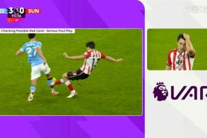 VAR介入,裁判观看回放后改判直红。