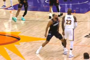 比赛最后时刻,狄龙飚中三分后不满被詹姆斯扑倒,起身与詹姆斯对撞吃T,累积两T被驱逐。