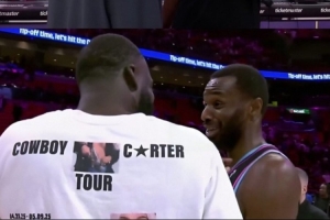 赛后,追梦和维金斯寒暄,库里也和阿德巴约聊聊。